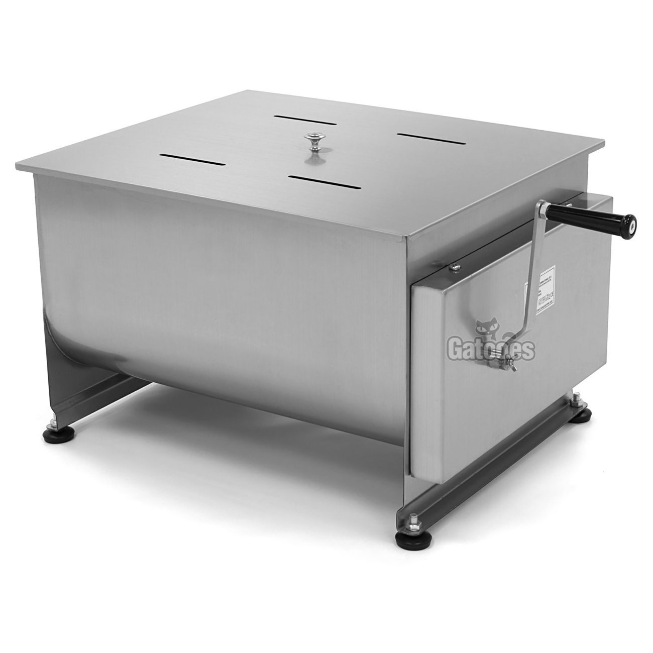 Es una amasadora de carne manual con doble eje fabricada en robusto acero inoxidable para uso profesional. Recomendada para el procesamiento de carnes con distintos aderezos de hierbas u otros ingredientes.
