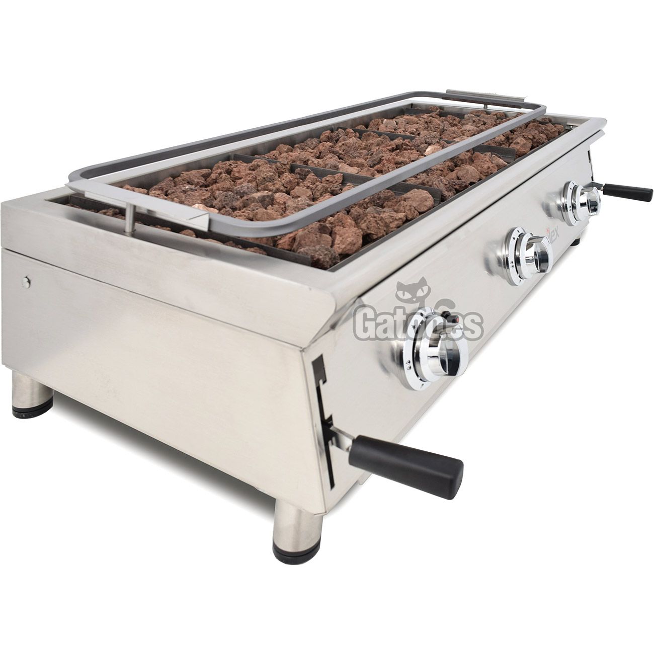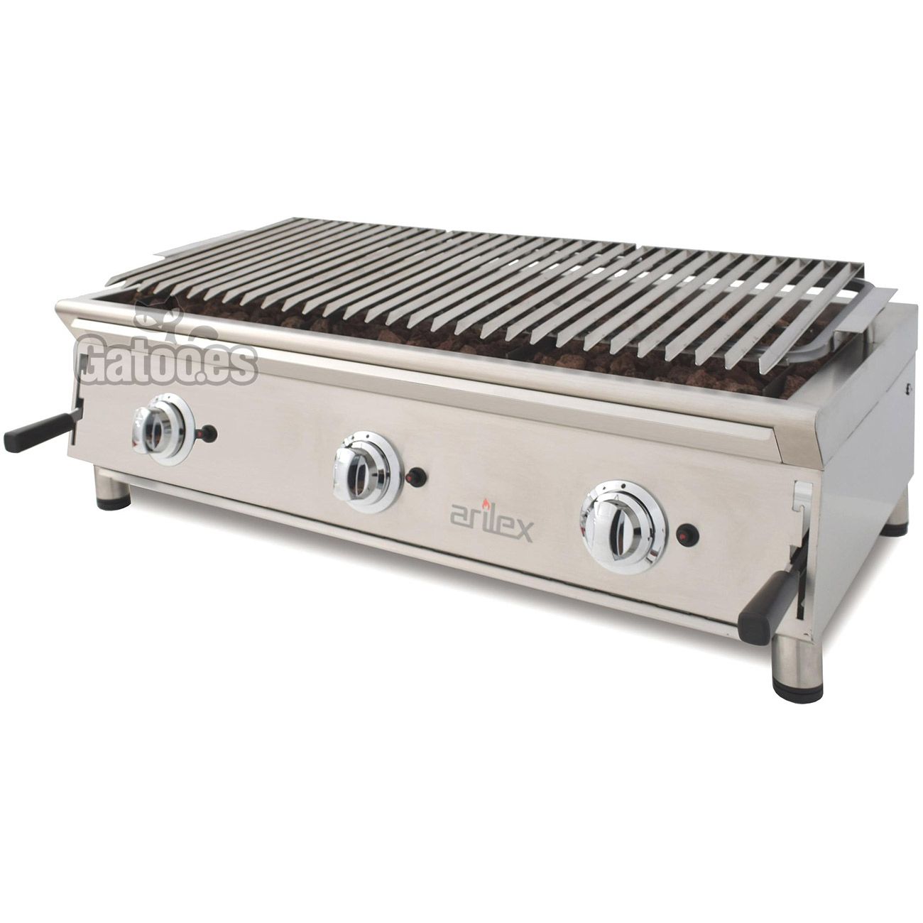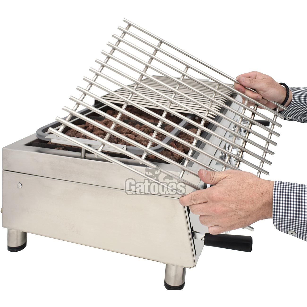La Barbacoa de gas de piedra volcánica está fabricada en España, especialmente recomendada para negocios profesionales de hostelería que tengan un uso intesivo en sus cocinas. La parrilla acanalada que se incluye es de acero inoxidable, que evita la corrosión y es para asar carnes y verduras. Puede regularse la parrilla a 3 alturas diferentes con los mandos laterales y por medio de anclajes. Como opción se puede añadir otra parrilla de varillas en acero inoxidable, especial para el asado de pescado. También se incluye en dotación una bolsa de 3 kilos de piedras volcánicas incombustible y refractaria, con la opción de poder añadir otra bolsa adicional.