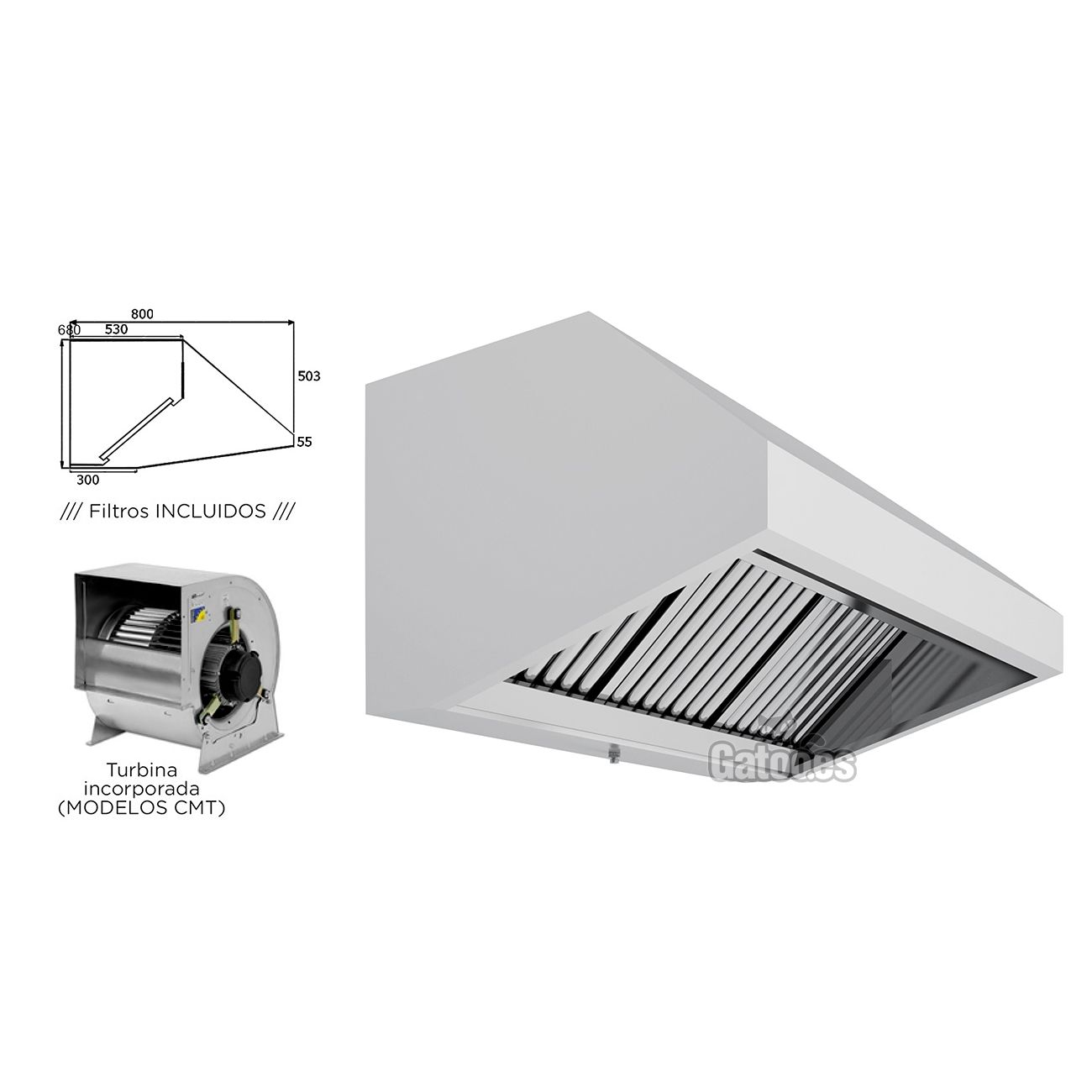 Campana extractora industrial mural con turbina de robusta calidad construida totalmente en Acero Inoxidable AISI-430, con acabados bien rematados de cantos doblados sin partes afiliadas. Modelo especialmente indicado para cocinas profesionales del sector gastronómico y de hostelería como bufets, cafeterías, bares, restaurantes, hoteles, locales de comida rápida, etc.