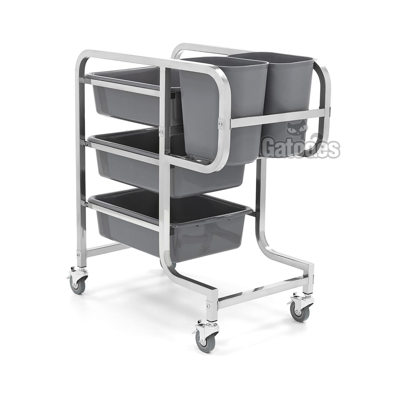 Es un carro de limpieza industrial construido en Acero Inoxidable equipado con 5 papeleras robustas en plástico extraíbles. Destinado para la limpieza de locales de hostelería y negocios profesionales como hoteles, bares, restaurantes, bufets, cafeterías, etc.