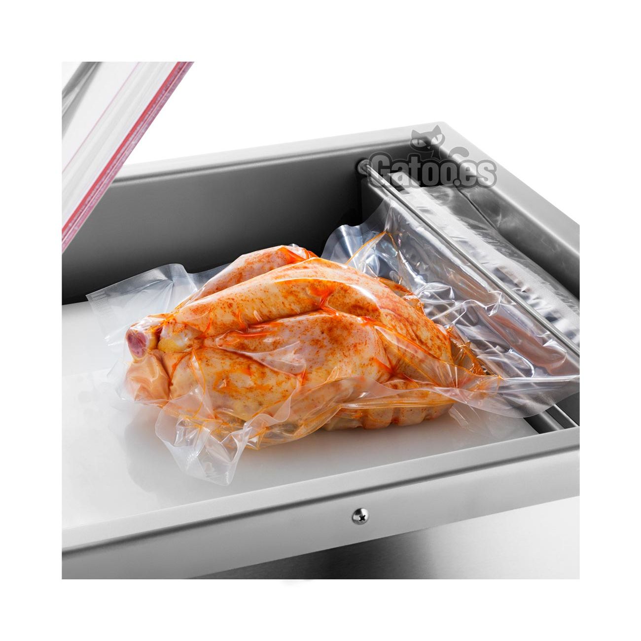 Modelo de envasadora de vacío profesional vertical de cámara o cámara destinada exclusivamente al sector de la restauración y hostelería, para negocios con un elevado volumen de trabajo. Se consiguen resultados totalmente profesionales, sacan el aire y realizan un sellado perfecto haciendo hasta el 99,5% de vacío en bolsas para alimentos sólidos, en polvo, blandos y productos farmacéuticos.