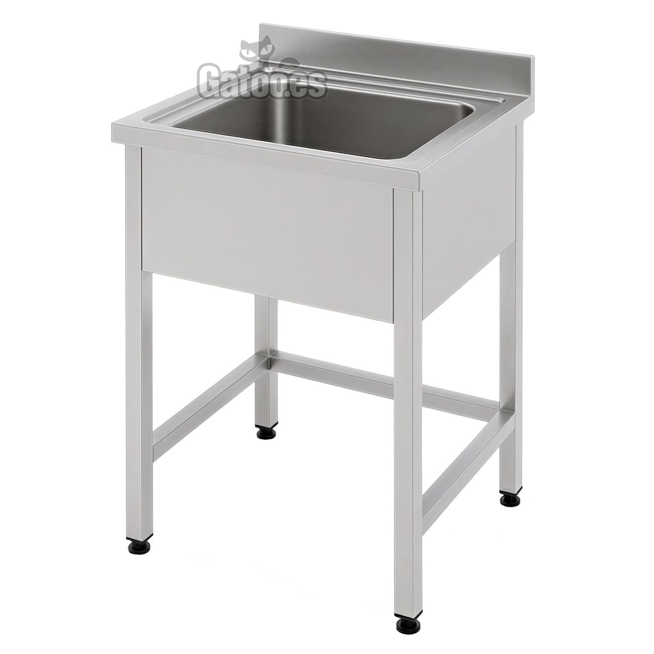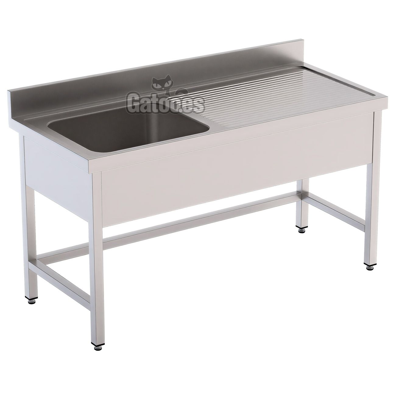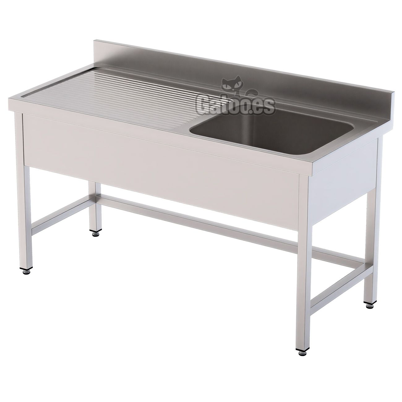 La encimera del fregadero dispone de un peto trasero de 10 cm. y laterales de 6,5 cm. con borde anti-derrame para evitar que el agua caiga al suelo. También incorpora un faldón bajo encimera que oculta la parte inferior de la cuba, ofreciendo un aspecto más profesional y un diseño más ordenado. Las patas del fregadero son de tubo cuadrado de 4 cm. x 4 cm. en acero inoxidable AISI304 con regulación de altura entre 85 y 90 cm. Además integran travesaños que aseguran una total estabilidad.