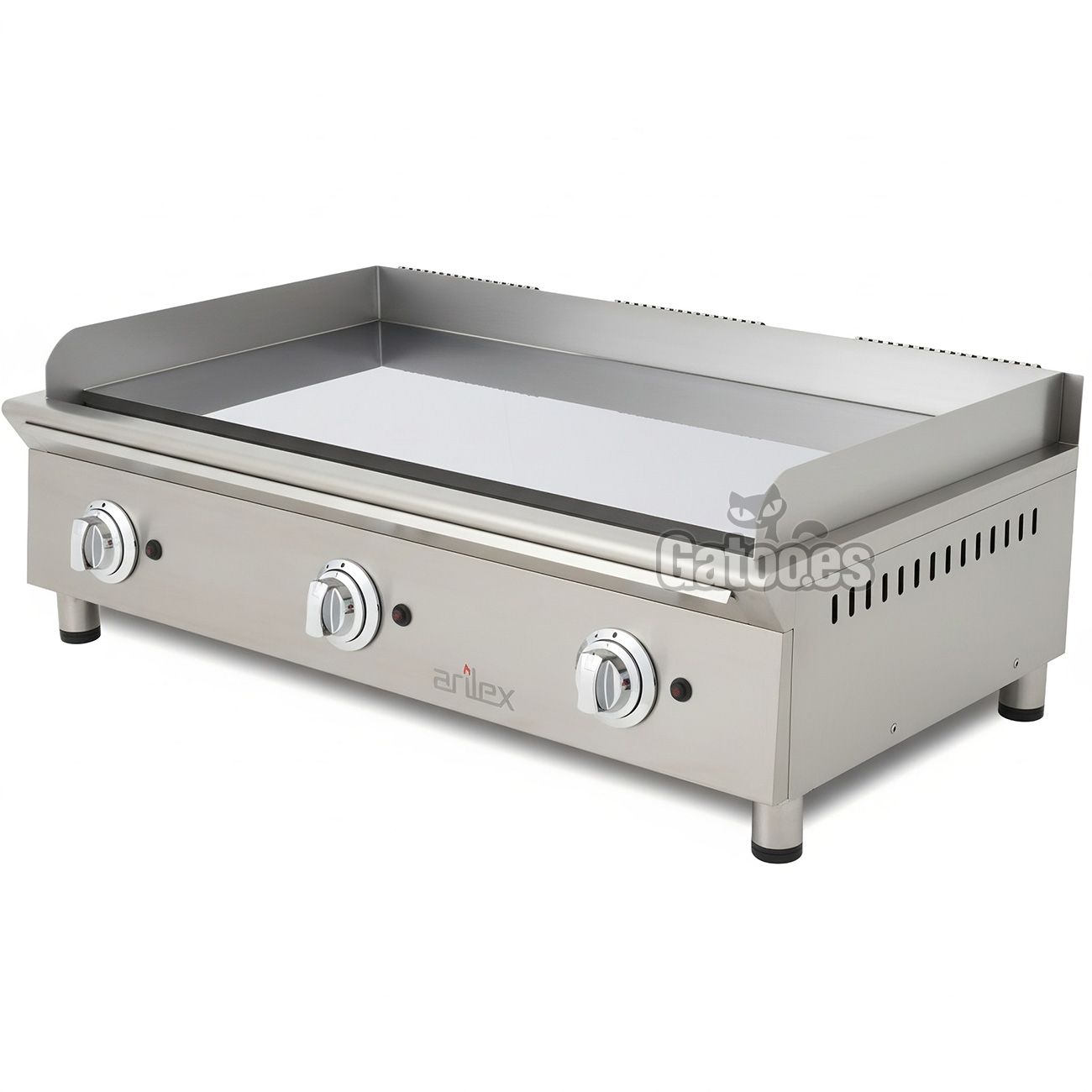 Cabe destacar sus quemadores, diseño exclusivo Arilex, de encendido piezoeléctrico automático que aseguran un reparto del calor uniforme por toda la placa sin dejar zonas frías. La bandeja recoge grasas está en el frontal, es de gran capacidad, extraíble para su limpieza y de acero inoxidable.