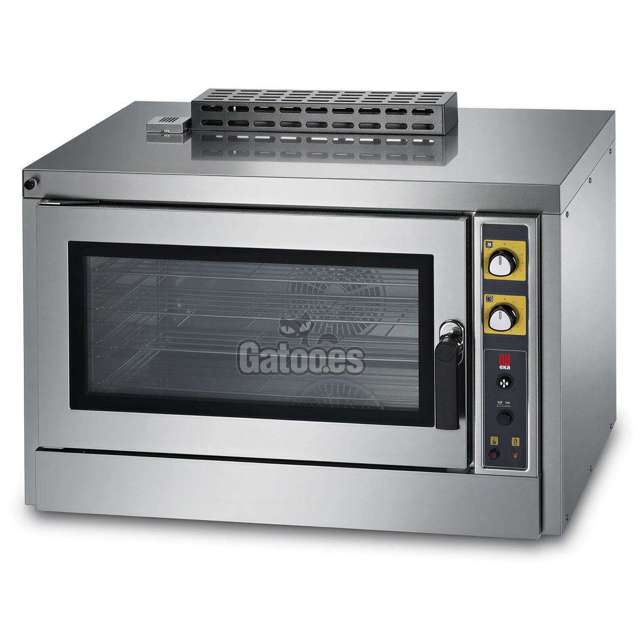 Un horno multigas industrial por ventilación de convección y humidificación indirecta predispuesto para usar con gas natural (metano) e incluso con butano o propano, ya que se incluye boquilla para GLP. Su funcionamiento es a través de un motor bidireccional con giro en doble sentido (reversible) y con intercambiador de calor exclusivo de EKA, que evita la pérdida de calor del interior expulsando al mismo tiempo los gases hacia el exterior. La función de vapor indirecto se activa manualmente por medio de pulsador, cuando se necesite pegar un golpe de humedad al producto, para darle un toque dorado o hacerlo más esponjoso.