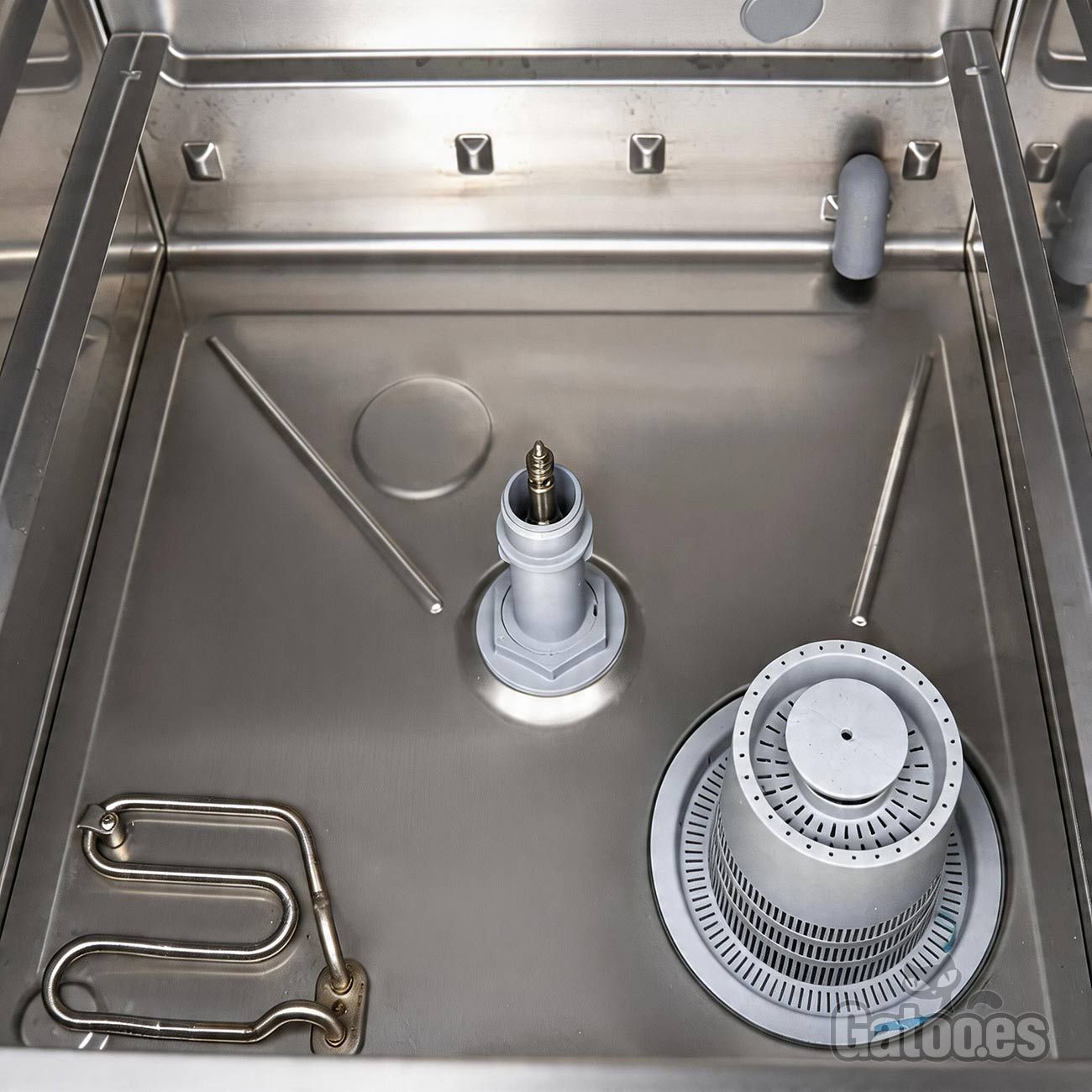 El lavado se realiza a 60ºC y el aclarado final a 80ºC, lo que garantiza que los utensilios se sequen rápidamente por evaporación y cumplan con las normativas sanitarias.
