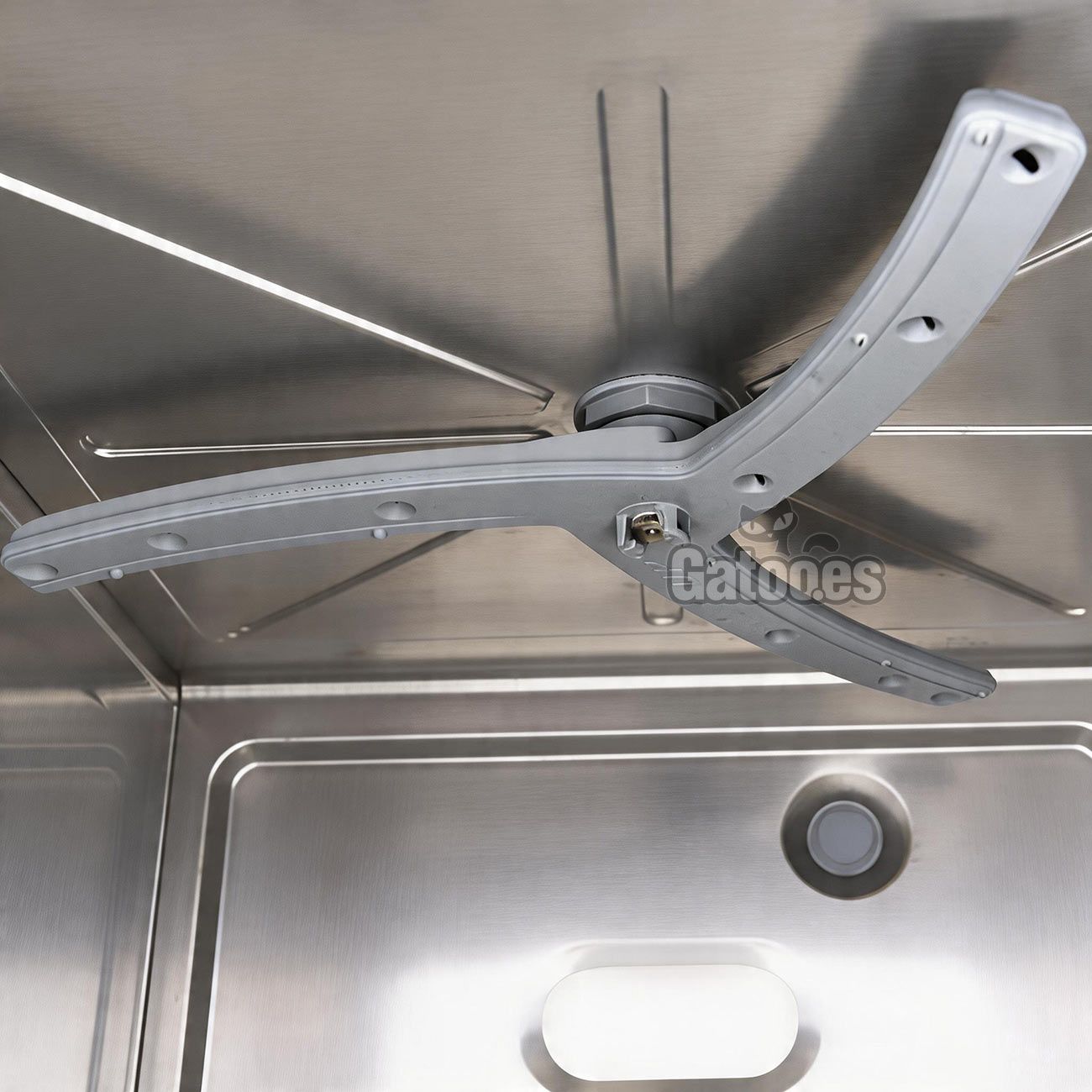 Este potente aparato está diseñado para desprender los restos de comida más difíciles mediante brazos de lavado y chorros de agua optimizados para el uso intensivo.