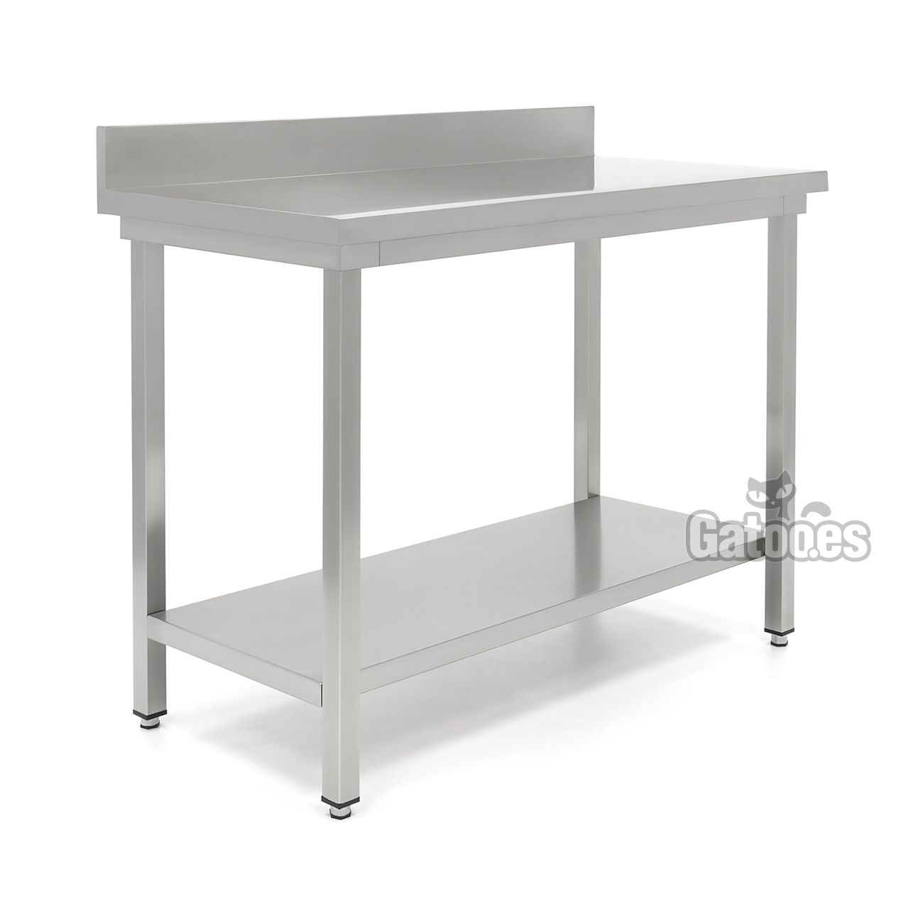 Tiene una encimera de trabajo con peto trasero reforzado con doble tablero con una capacidad de carga de 150 a 200 Kg. Cuenta con 1 estante inferior fijo en acero inoxidable y patas regulables en altura.