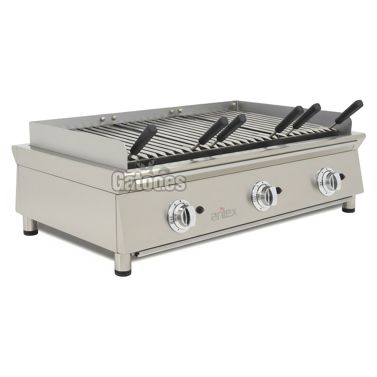 Parrillas de asar: con diseño acanalado hechas de acero inoxidable para cocinar carnes y verduras. Fabricación Española con dotación de piedras volcánicas incombustible y refractaria. Dispone de 3 parrillas acanaladas inox con una superficie de asar de 91,8 x 39,6 cm.