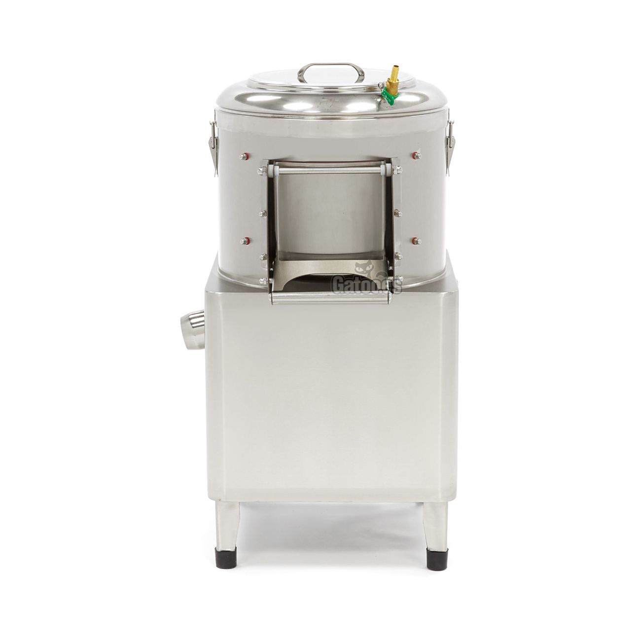 Es un pelador de patatas industrial con carcasa, recipiente y puerta construidos en Acero Inoxidable. Destinada para negocios de hostelería de bares, restaurantes y bufets que tienen un nivel alto de trabajo en sus cocinas y necesitan ahorrar tiempo a la hora de pelar hortalizas. En un ciclo de 2-3 minutos con el recipiente lleno pela hasta 8 kilos de patatas, zanahorias, nabos, remolachas, etc., llegando hasta una producción de 160 kilos por hora.