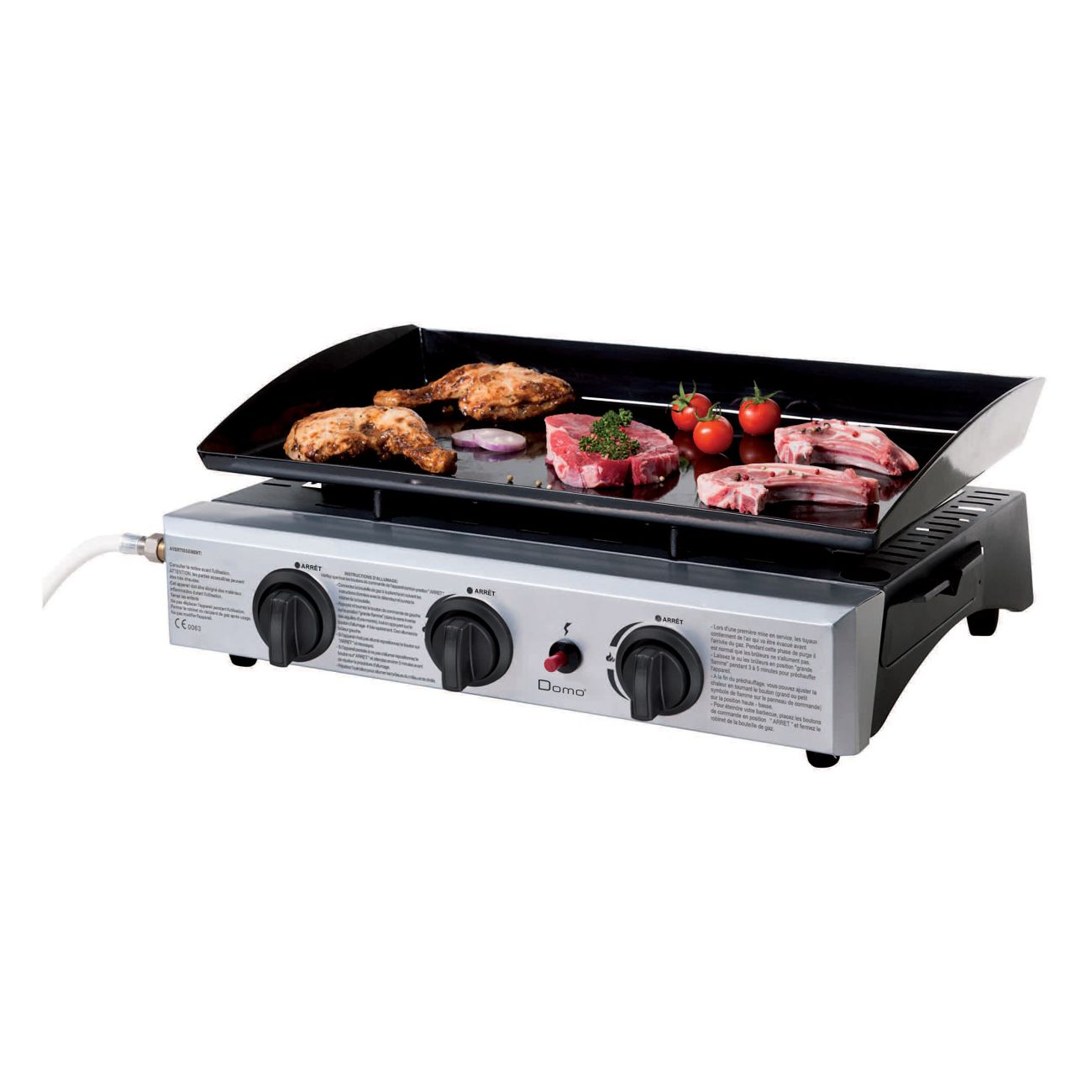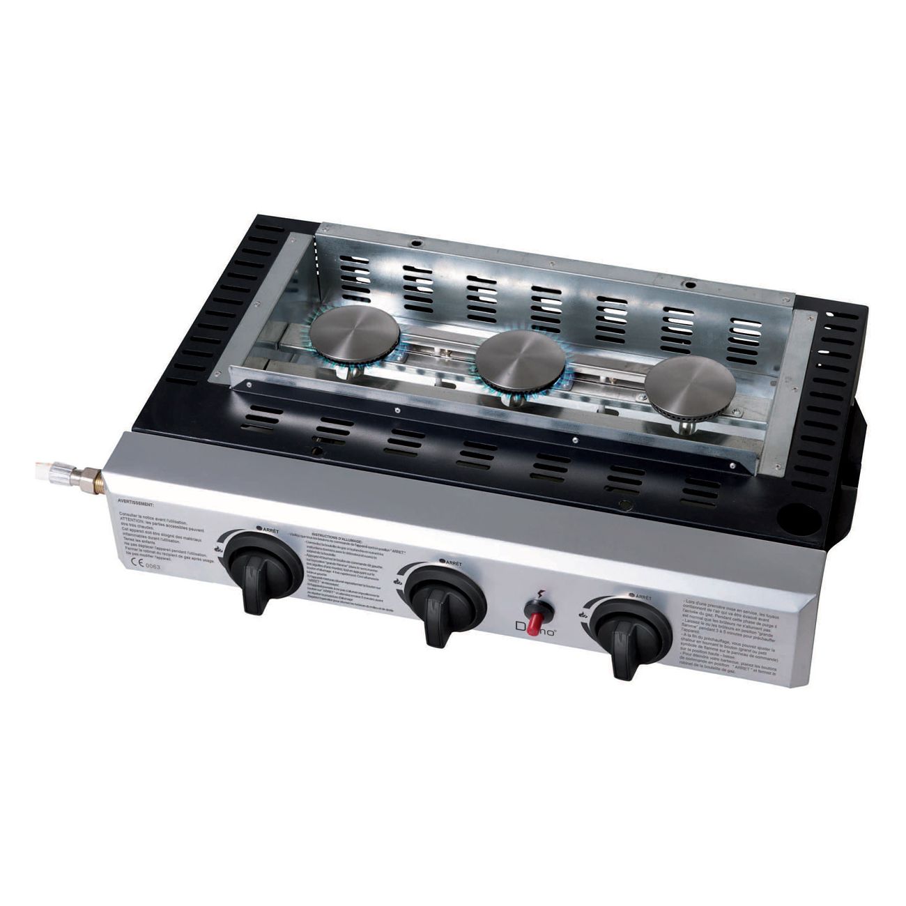Plancha de asar a gas con 3 fogones. Funciona con butano o con propano. Profesional, con superficie lisa.