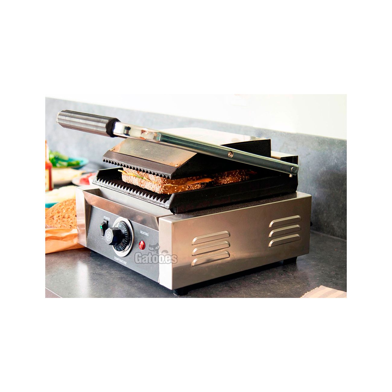 - Placas superior e inferior de hierro fundido, ambas cubiertas con capa antiadherente.